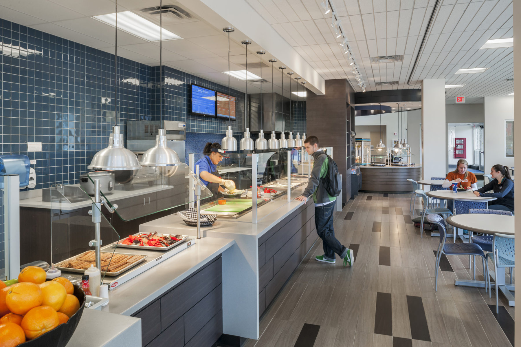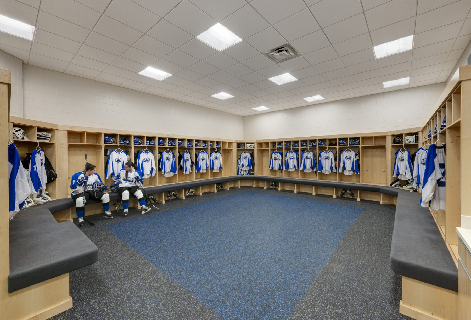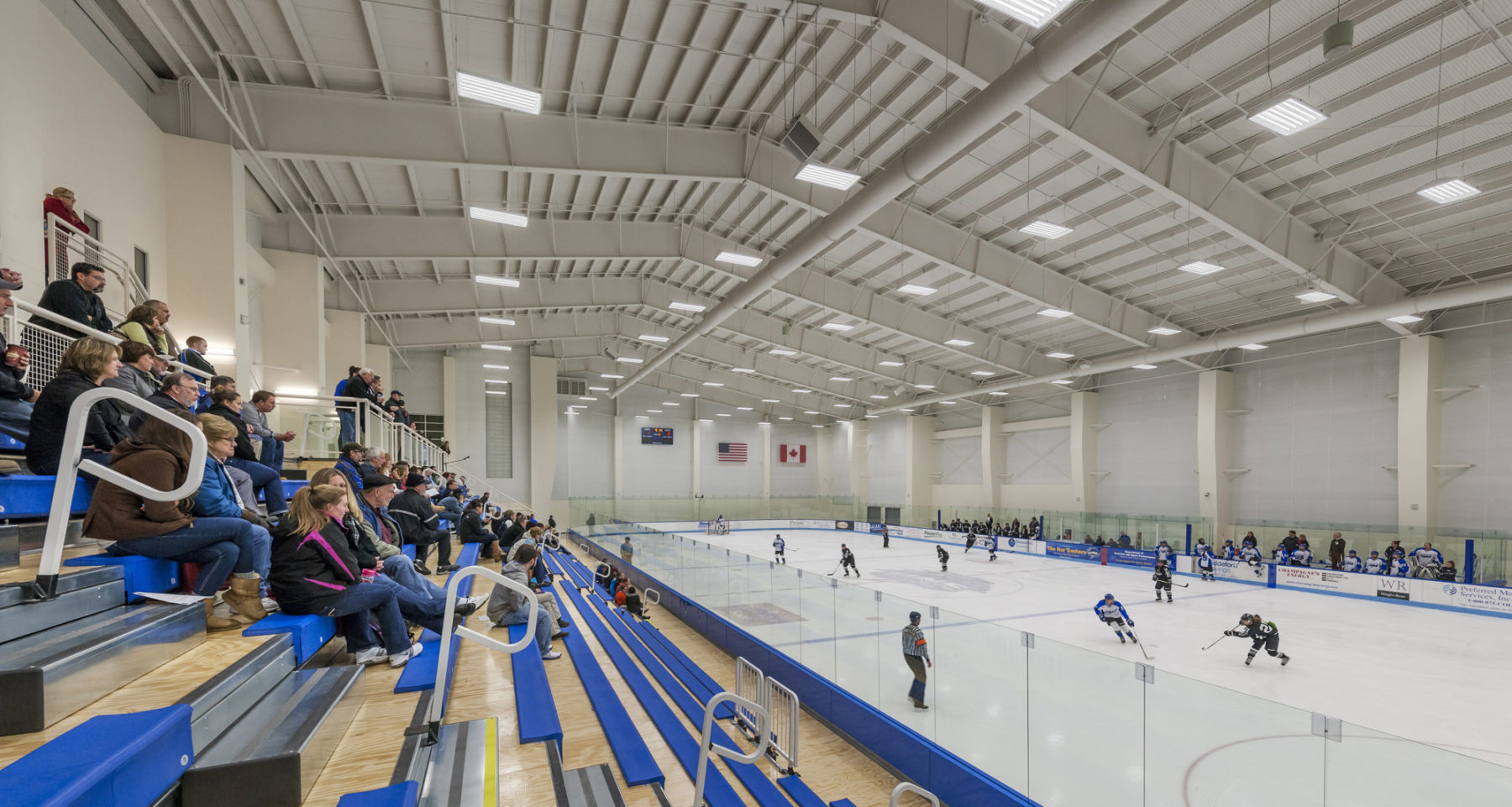 Visitors arriving at the two-story main lobby have immediate access to the café located to the left of the entry, a view of the ice rink straight ahead, and direct access to the fieldhouse and athletic support facilities. A grand open stair and elevator in the lobby lead to the ice arena seating. The stair and elevator also provide access to the second level athletic offices and academic facilities that include a lounge, faculty offices, classroom and labs, and a large meeting room overlooking the ice arena and field house.