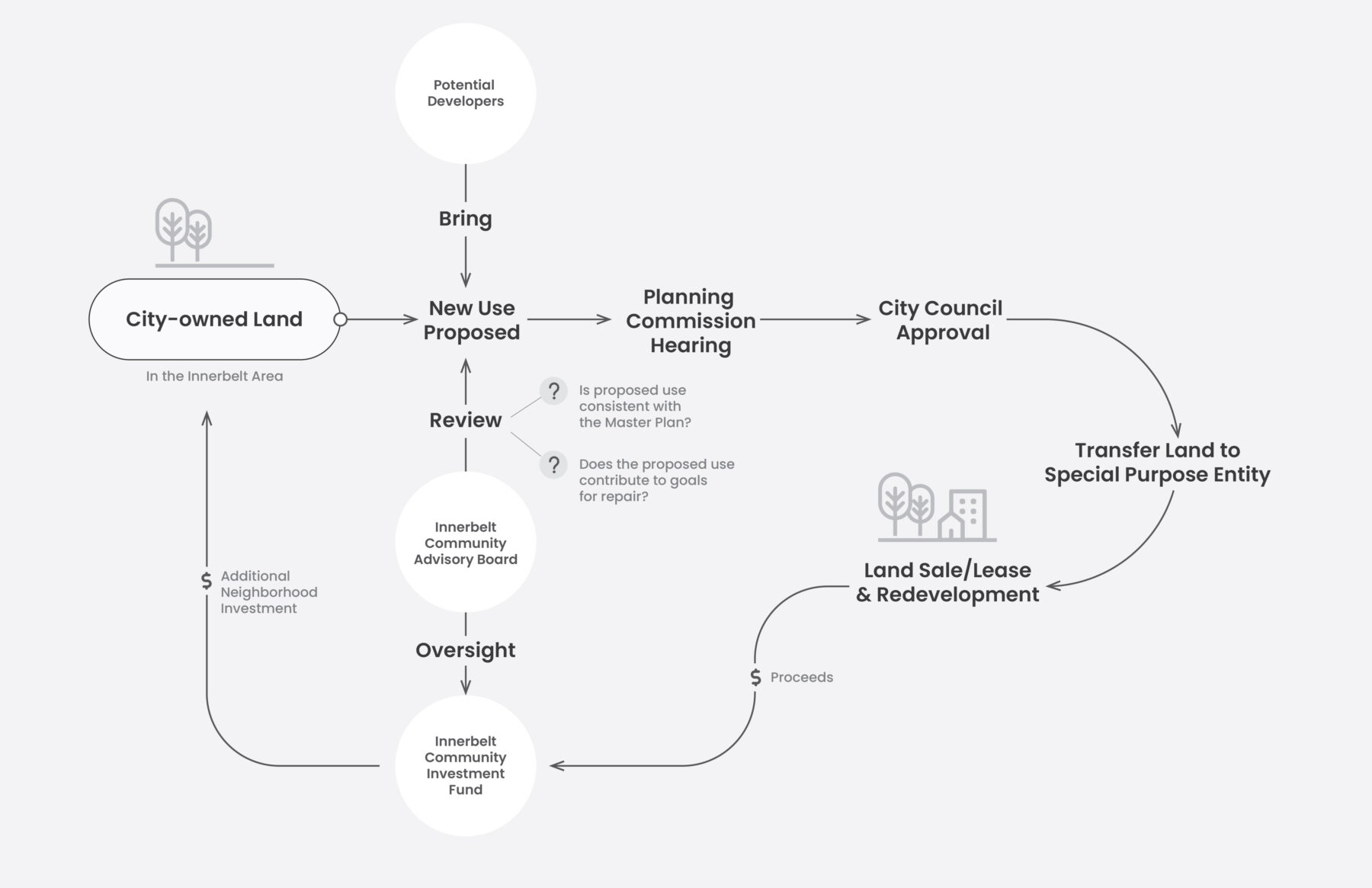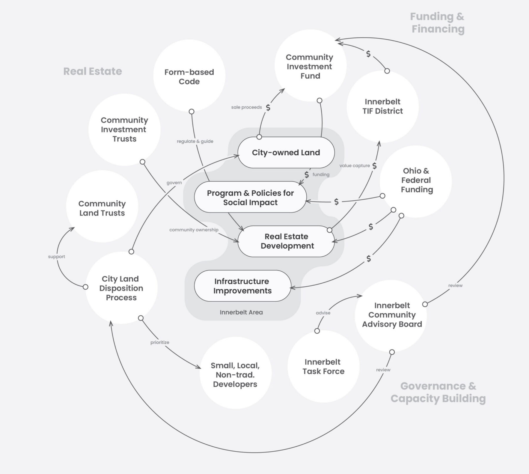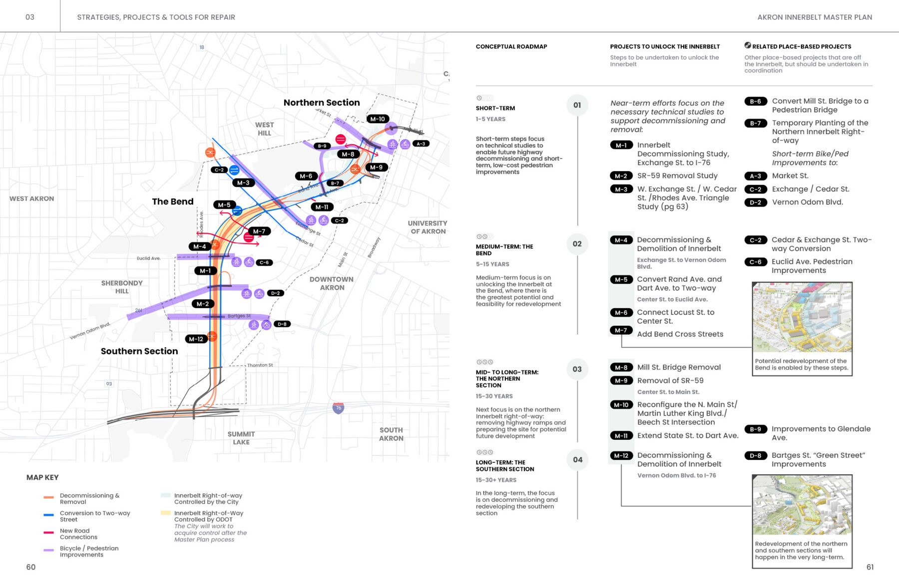 Undoing the Innerbelt is a multi-decade undertaking. To ensure its success, the Master Plan focuses on giving the City and the community practical tools and resources to ensure its long-term implementation and stewardship. The 30-year redevelopment vision is broken down into a prioritized roadmap of discrete infrastructure and development projects, intended to be undertaken incrementally. Recommendations for form-based zoning and enhanced community oversight over public land disposition further ensure that future development adheres to the spirit of the Master Plan.