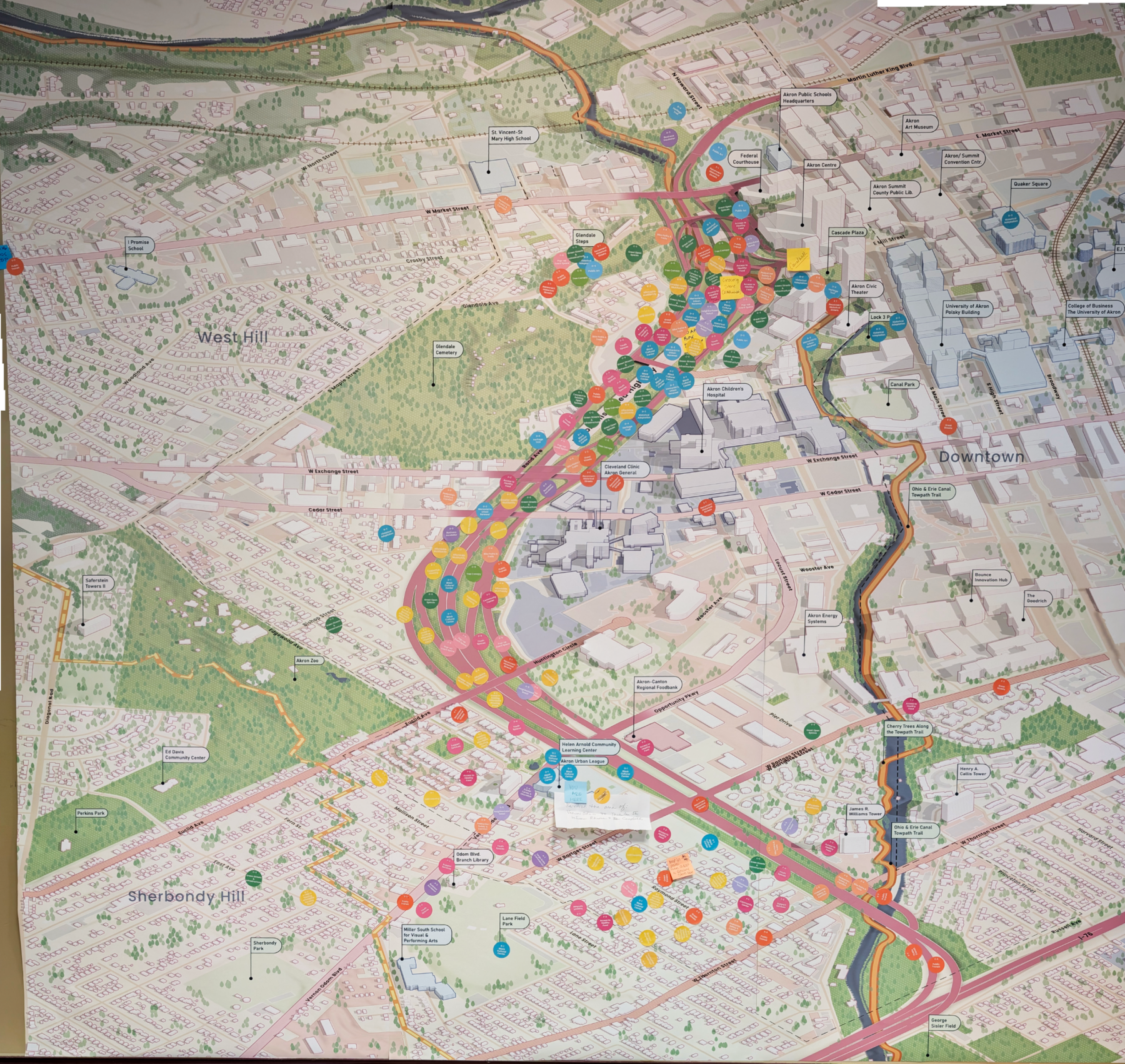 Funded by a U.S. Department of Transportation “Reconnecting Communities and Neighborhoods” grant, the City of Akron selected Sasaki to lead the development of the Master Plan, which focuses on the future of the land under the Innerbelt and its broader impact area. The project included a robust team of subconsultants, including transportation and infrastructure, engagement and community development, urban design support, as well as Akron-based community coordinators Carla Davis and Ebony Hill. The Master Plan aims to repair the highway’s historic harm in all of its facets – reconnecting neighborhoods, generating inclusive economic development, creating wealth building opportunities for residents, memorializing the past, and celebrating the city’s future potential.